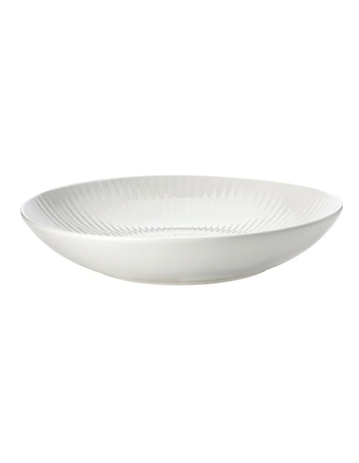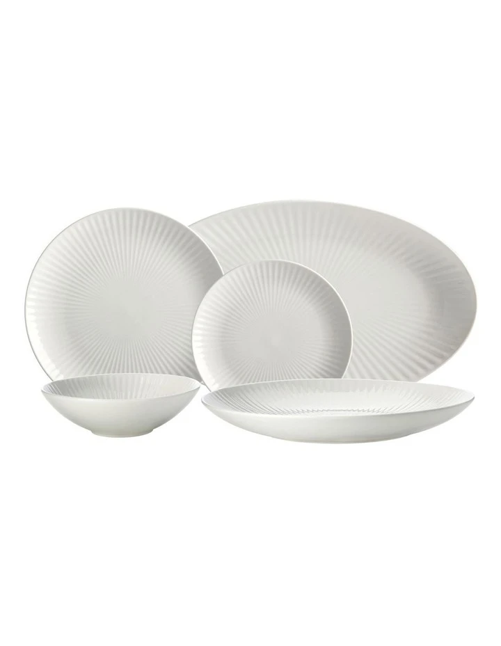 The Radiance entertainer’s sets show off the timeless beauty of crisp white porcelain, with a simple motif reminiscent of sunlight rays. The central design has a rippling textural finish created with embossed lines. Both sets combine a classic dinner set with two servingware pieces – everything you need for your next dinner party.