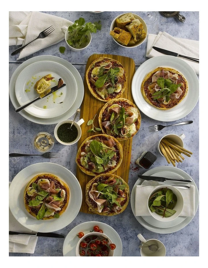 This comprehensive 16 Piece Dinner Set in Royal Doultons bold Pacific Mint colour way provides a complete table setting for four, including dinner plates, side plates, cereal bowls and mugs.