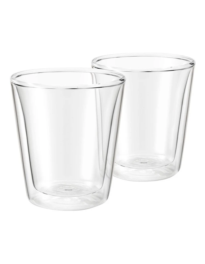 The Espresso Duo in dual wall thermal heat resistant glass keeps coffee hot. Dishwasher, Microwave, Freezer and Oven Safe
