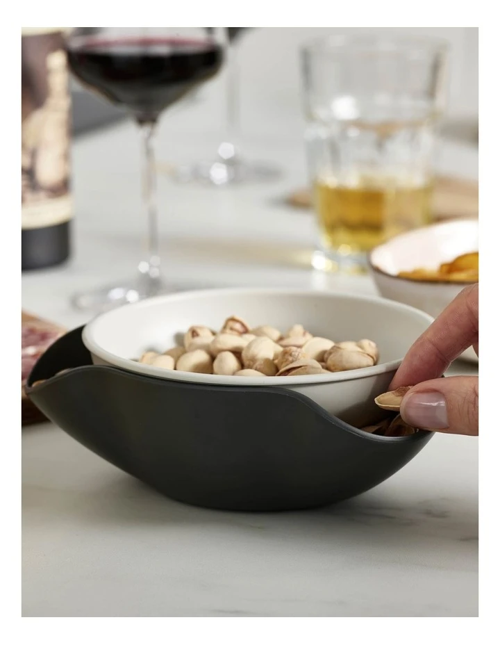 This clever bowl provides the perfect solution to serving snacks such as olives or pistachio nuts, with their inedible stones and shells. The unique design is actually two bowls stacked on top of each other, with the lower one curved outwards in three places creating chutes down which food waste can be dropped. As well as hiding unsightly waste, it also eliminates the need for any additional bowls or plates on the table that would normally be required to hold these items. Dishwasher safe.