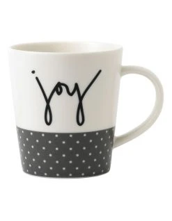 Ivory ceramic mug 475ml with white raised polka dots on a grey background and the word Joy in Ellen’s distinctive handwriting. Dishwasher and microwave safe it celebrates the positive in life just as the collection invites friends to share happy times together.