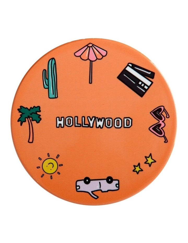 - Depicts iconic symbols of Los Angeles such as palm trees and clapperboard