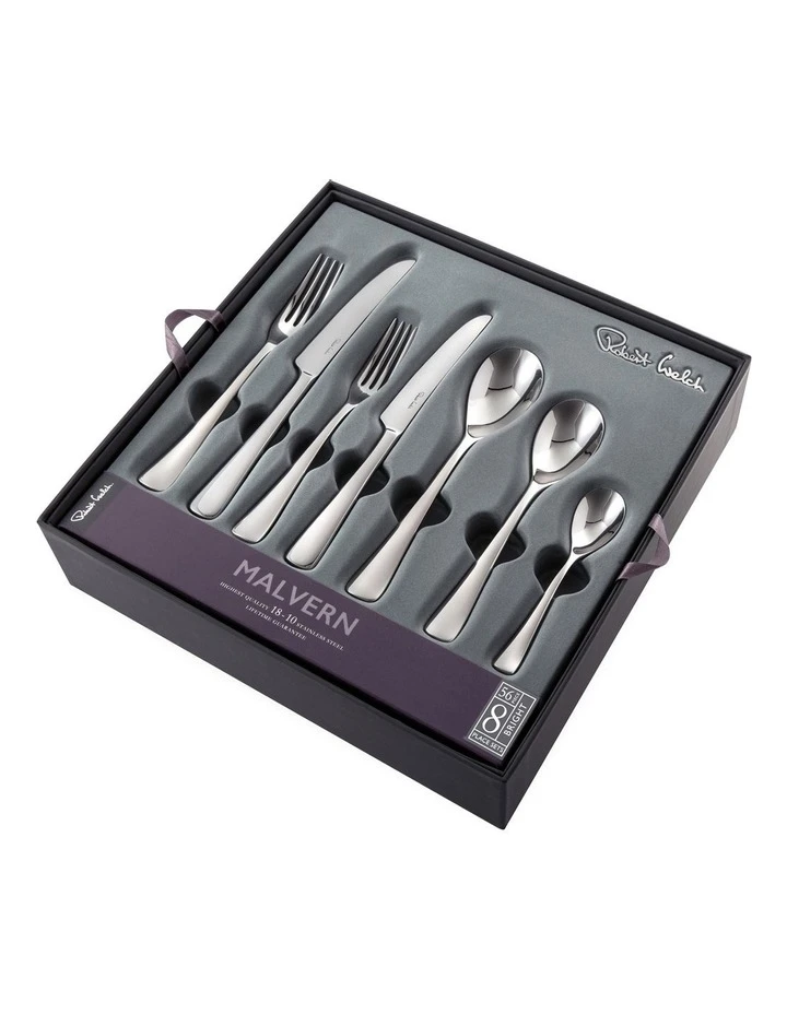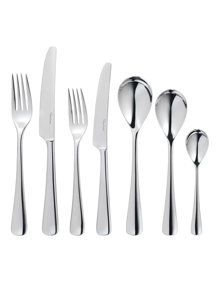 The handles of the Robert Welch MALVERN cutlery flare softly to a gently curved base. A 56 piece gift boxed cutlery set from the gently contoured MALVERN range.