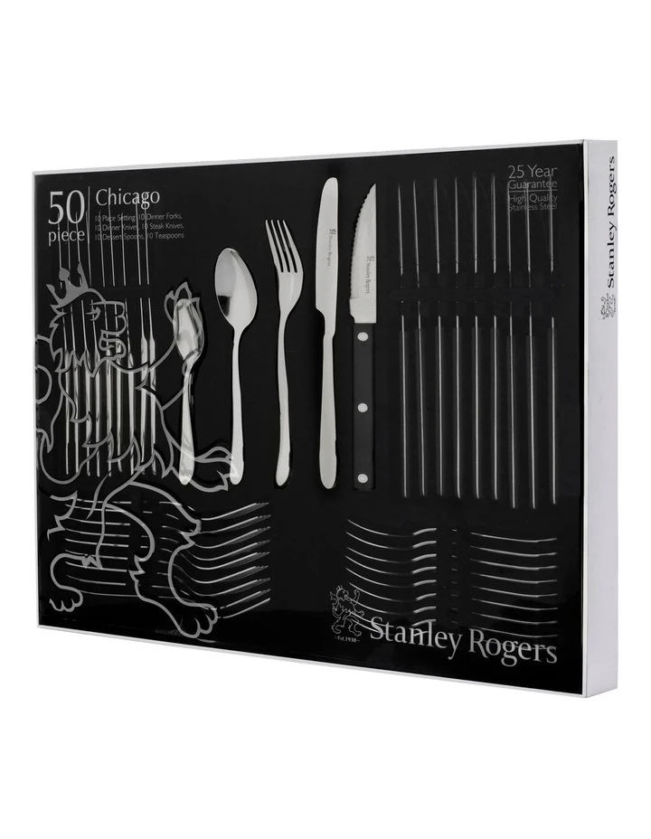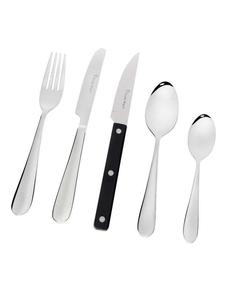 Timeless design with gentle curves. Triple riveted steak knives complete the set. High quality stainless steel with mirror finish. 25 year guarantee.