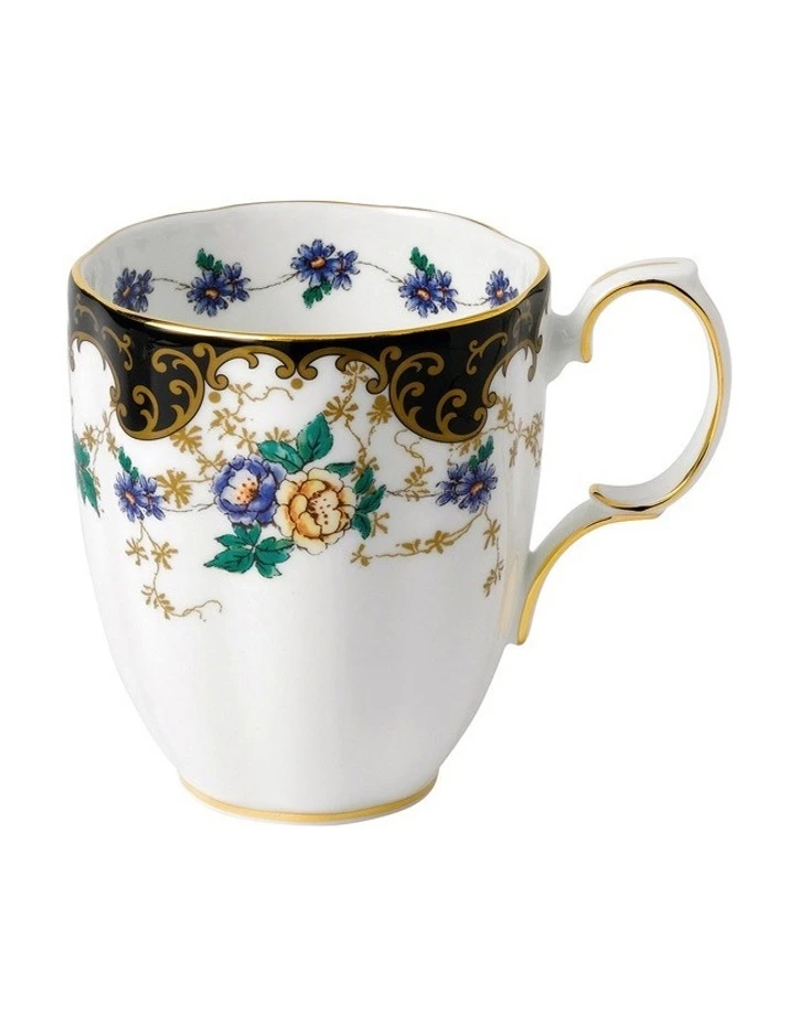 Many decorative styles including Rococo remained popular into the 20th century. A rich black border with swags of yellow and lavender roses, set among soft green leaves and interspersed with asters are linked by delicate golden daisies.