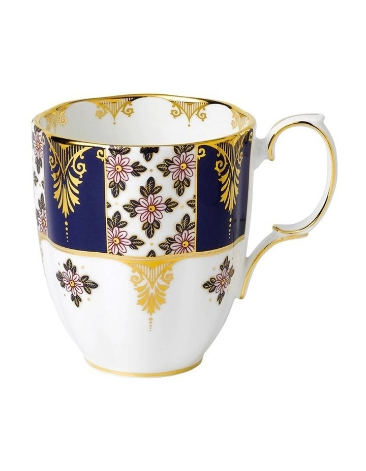 The late part of the 19th century saw a revival of interest in the classic designs of the Regency era. It became fashionable to combine different patterns, colours and gold to create sumptuous designs. Alternate panels of cobalt blue and white grounds, filled with deep maroon daisies and gold accents complete the design.