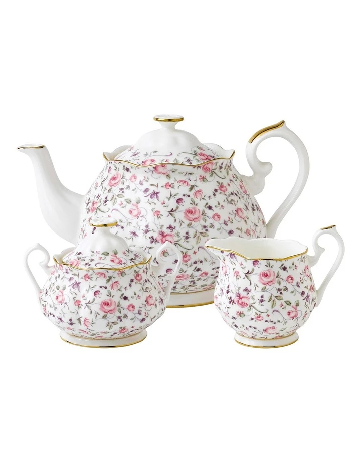 Tiny pink rosebuds decorate the Rose Confetti 3 Piece Tea Set, offset with pale pink and crisp white. Set includes 1 x Teapot 1.2L, 1 x Sugar Bowl 350ml, 1 x Cream Jug 350ml.