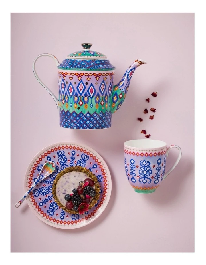 Enjoy a taste of the exotic with Teas & Cs Zanzibar. Inspired by the bold colours and designs of Eastern cultures, this porcelain teaware has a vibrant, eclectic feel. This range is all about the ritual of enjoying your favourite brew and maybe something sweet to go with it. Zanzibar features a selection of contemporary shapes, including a lidded mug, a sugar bowl, footed cake stands, jugs, charming porcelain spoons and a cake server, all finished with a touch of real silver.