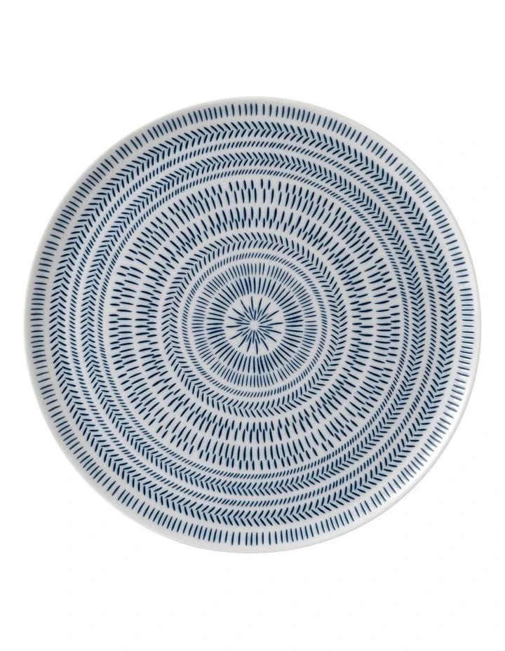 White ceramic platter 32cm fully patterned with the unique hand drawn chevrons and lines pattern debossed in a vibrant cobalt blue. Dishwasher and microwave safe this ‘hero’ piece of the range is a great centre table sharing plate for casual dining at home.