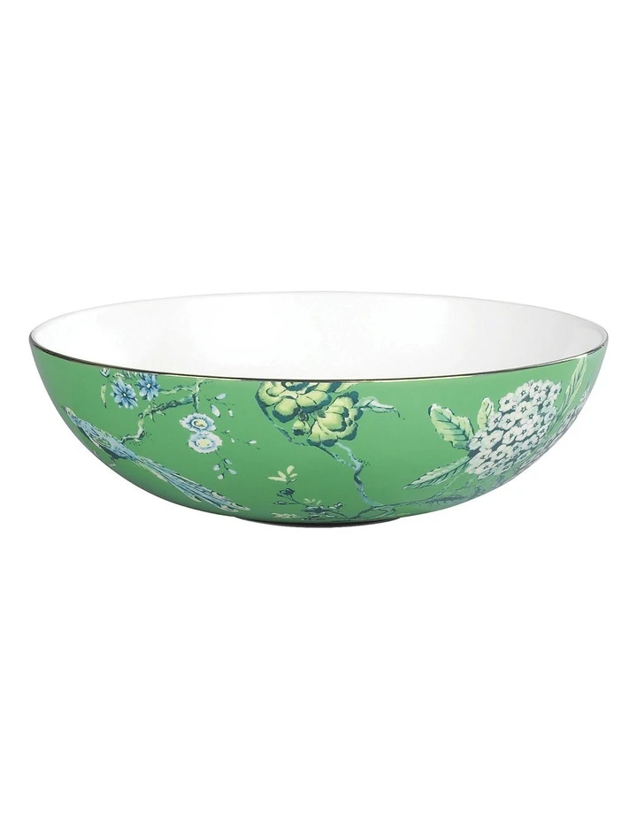 The innovative interpretation of the 18th century British trend for patterns from the East Jasper Conran Chinoiserie Green features an exquisite pattern of exotic flowers, foliage and birds set against a richly toned backdrop edged in platinum. Set against a wooden table with colourful flowers, silver cutlery and white linen this is a decidedly modern way to create a formal dining statement.