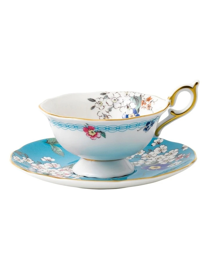 The Wonderlust Apple Blossom Teacup & Saucer is crafted from fine bone china and features the enchanting apple blossom flower with beautiful blue accents. Presented in a Wedgwood blue gift box and ideal matched with your favourite blend of tea.