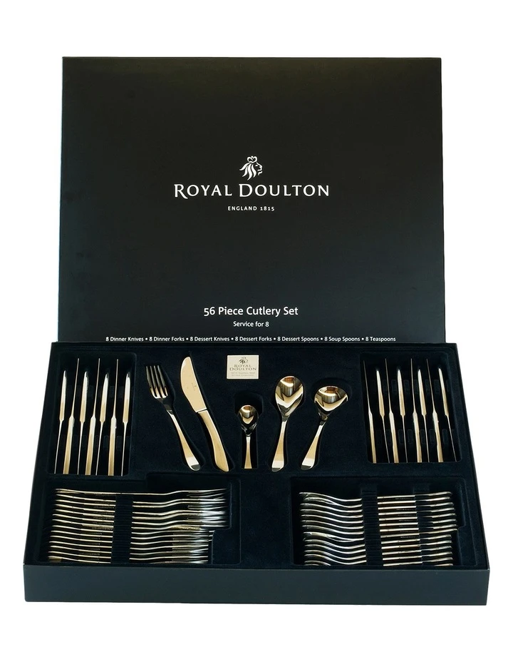 Beautiful and contemporary, the Lucido pattern of tableware is characterised by a smooth, curved design aesthetic and a crisp and elegant stainless steel finish. The result is achingly modern and sophisticated. 56 piece flock-lined gift-boxed set includes: 8 place settings of Dinner Knife, Entree Knife, Dinner Fork, Entree Fork, Soup Spoon, Dessert Spoon and Teaspoon.